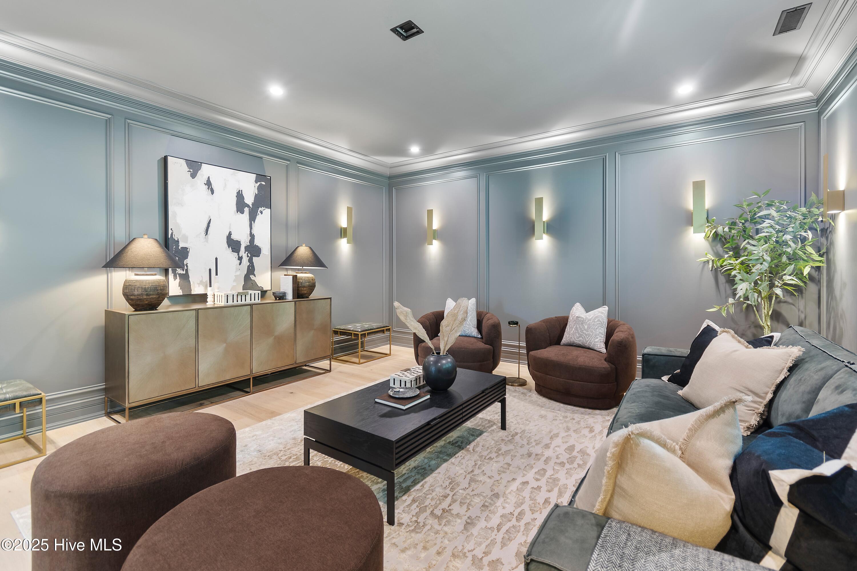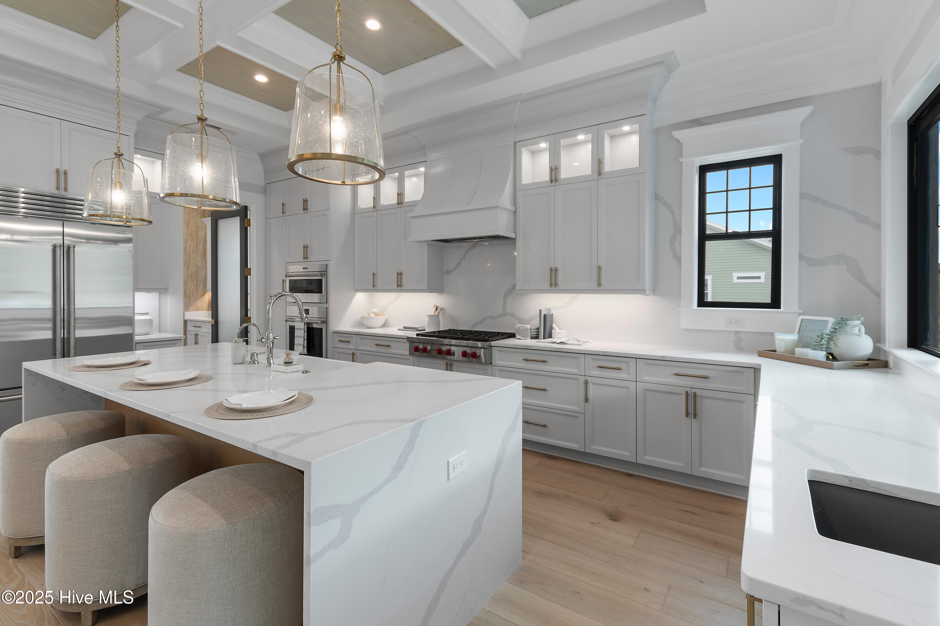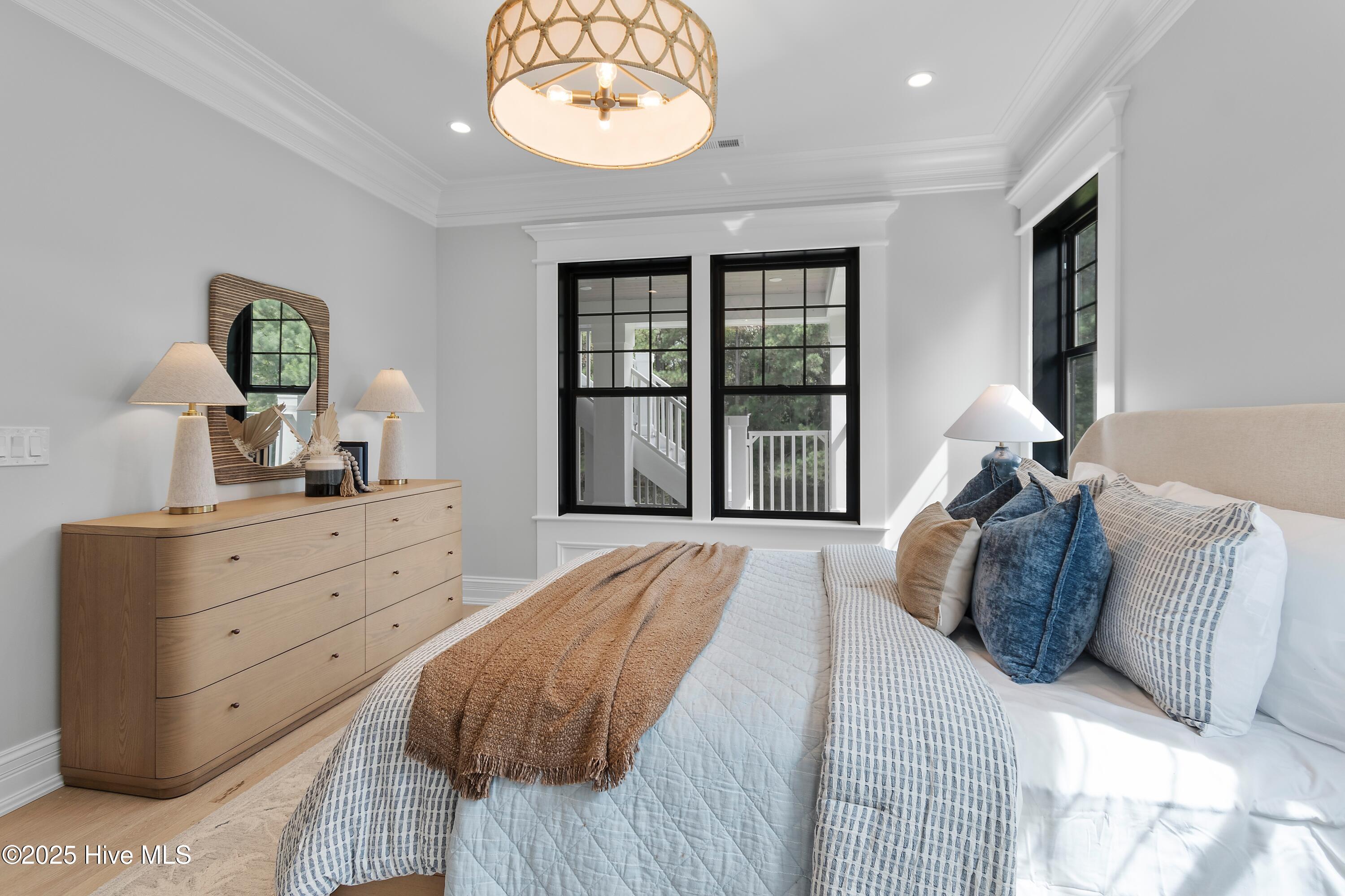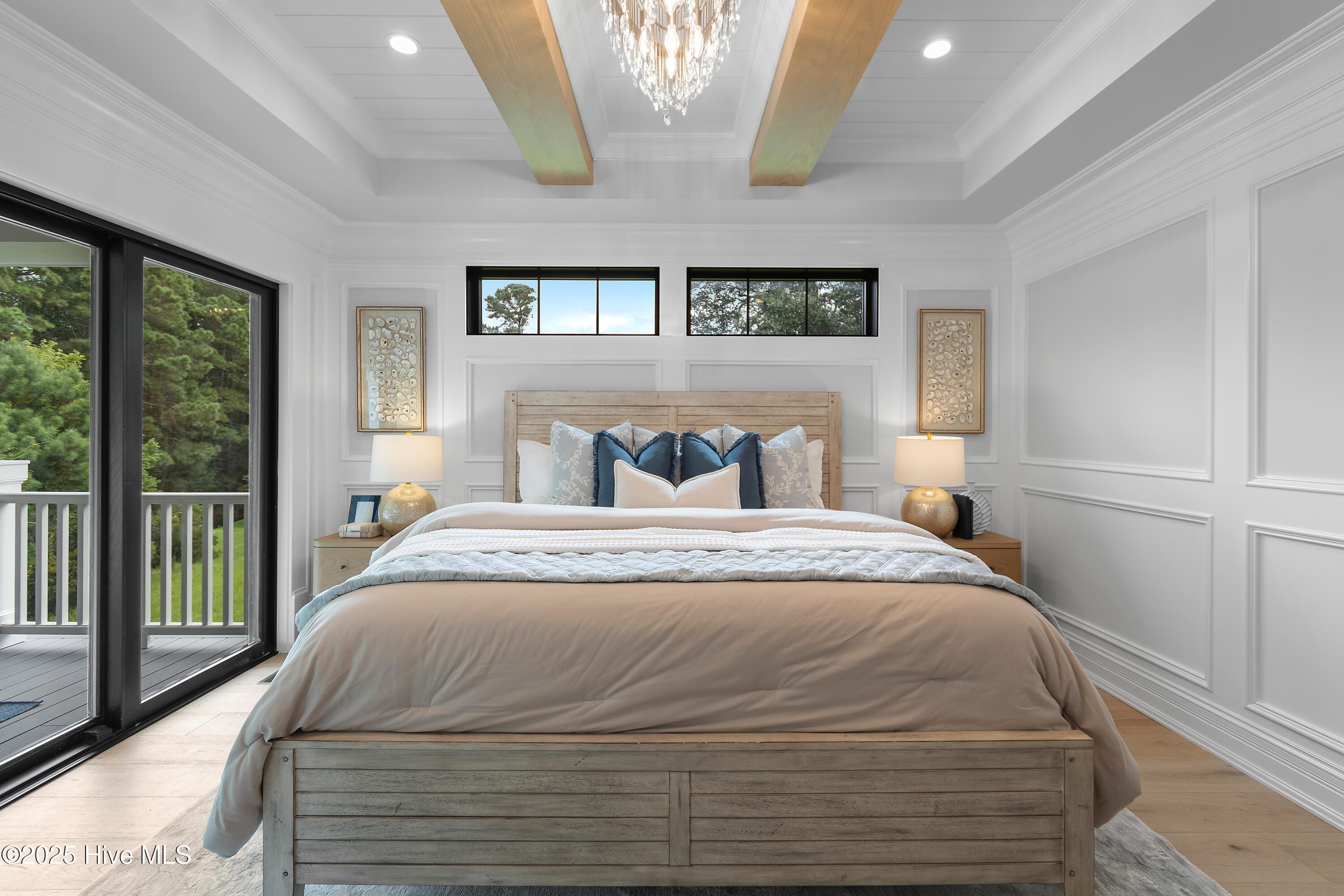 The second floor includes a welcoming entry with a versatile office space. The master bedroom serves as a spacious and elegant retreat featuring a beautiful beam ceiling, accompanied by a large master bath with luxurious amenities and a walk-in closet offering ample storage. Additionally, there is a fun and functional bunk area with built-in beds for additional sleeping arrangements. Bedroom number three is well-appointed with a walk-in closet. Completing this floor is an expansive rear deck, perfect for relaxing and entertaining. The third floor boasts a great room with a fireplace and a diamond-shaped coffered ceiling, creating an impressive space for gathering. Adjacent is a sitting room with a built-in wet bar and wine cooler, perfect for hosting and enjoying refreshments. The dining area provides an inviting space for meals and celebrations.
