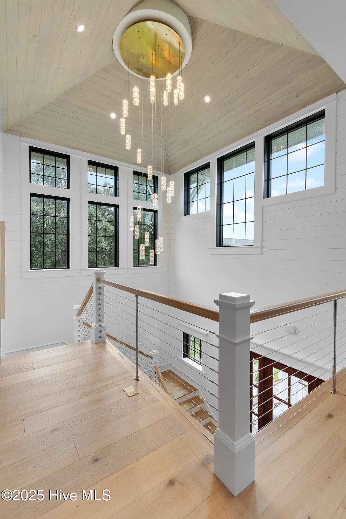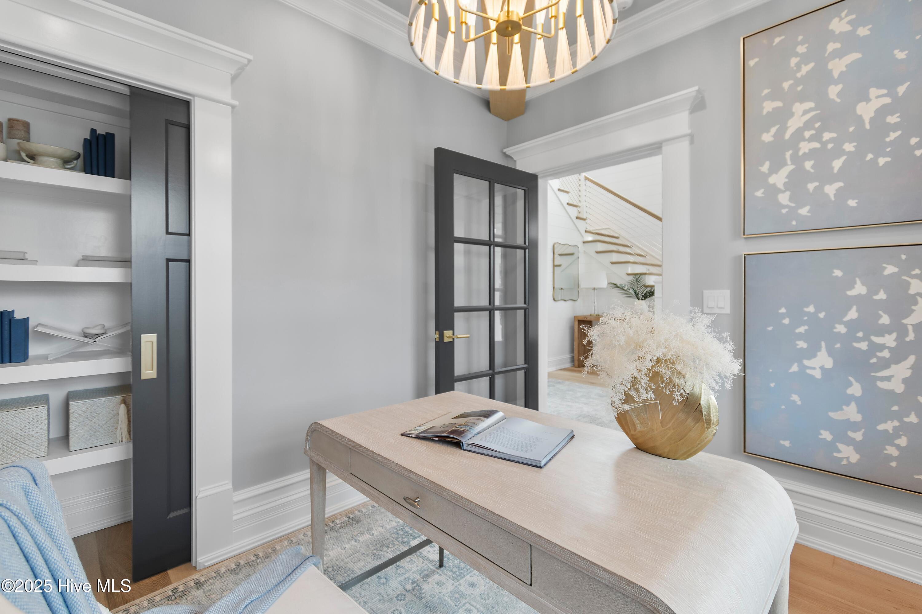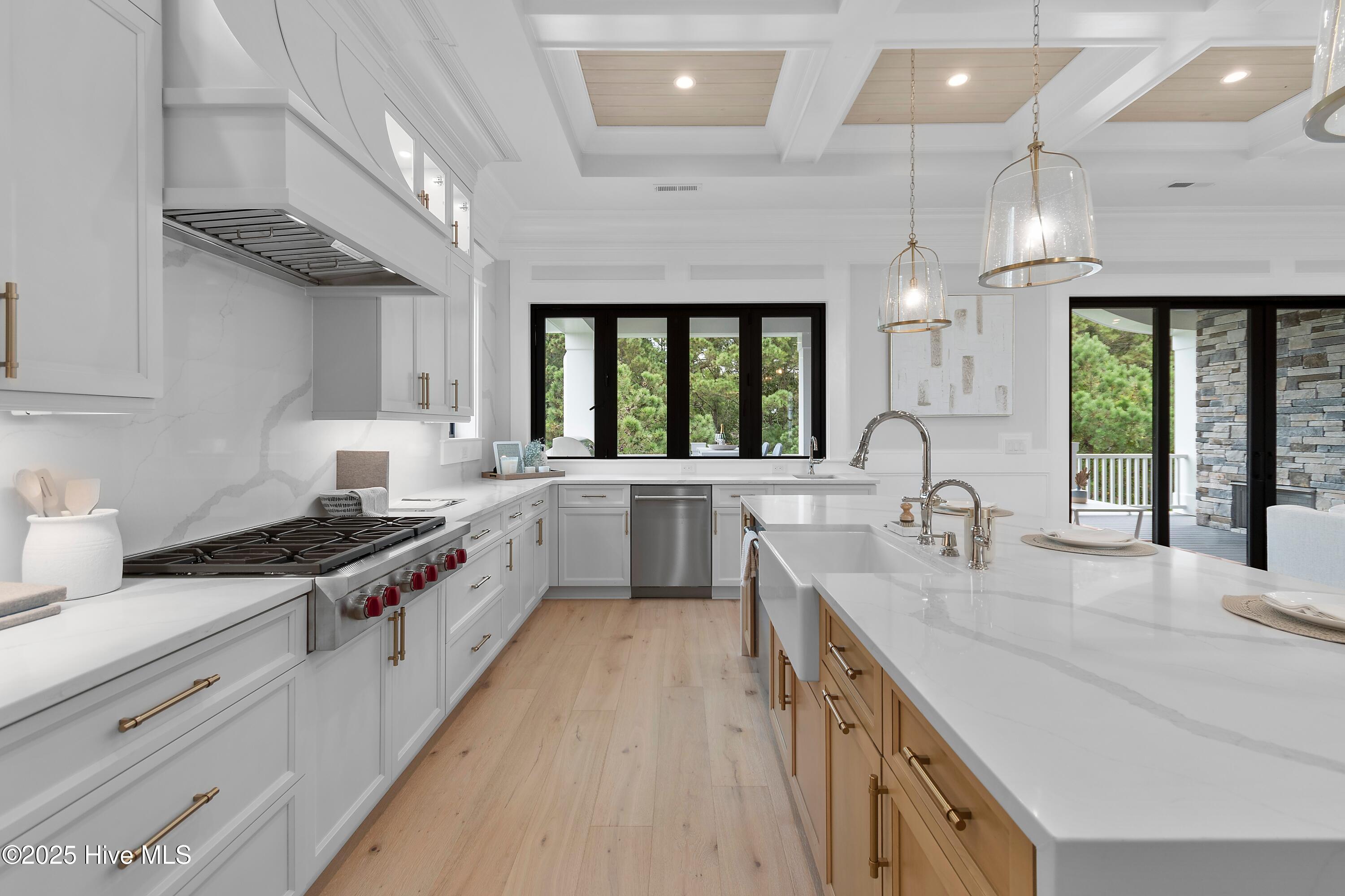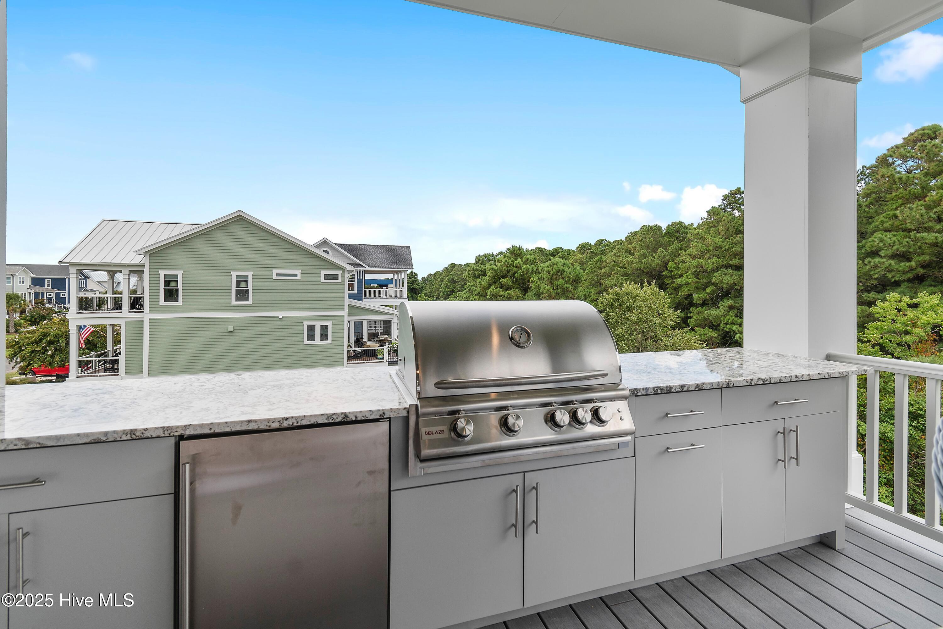 The second floor includes a welcoming entry with a versatile office space. The master bedroom serves as a spacious and elegant retreat featuring a beautiful beam ceiling, accompanied by a large master bath with luxurious amenities and a walk-in closet offering ample storage. Additionally, there is a fun and functional bunk area with built-in beds for additional sleeping arrangements. Bedroom number three is well-appointed with a walk-in closet. Completing this floor is an expansive rear deck, perfect for relaxing and entertaining. The third floor boasts a great room with a fireplace and a diamond-shaped coffered ceiling, creating an impressive space for gathering. Adjacent is a sitting room with a built-in wet bar and wine cooler, perfect for hosting and enjoying refreshments. The dining area provides an inviting space for meals and celebrations.