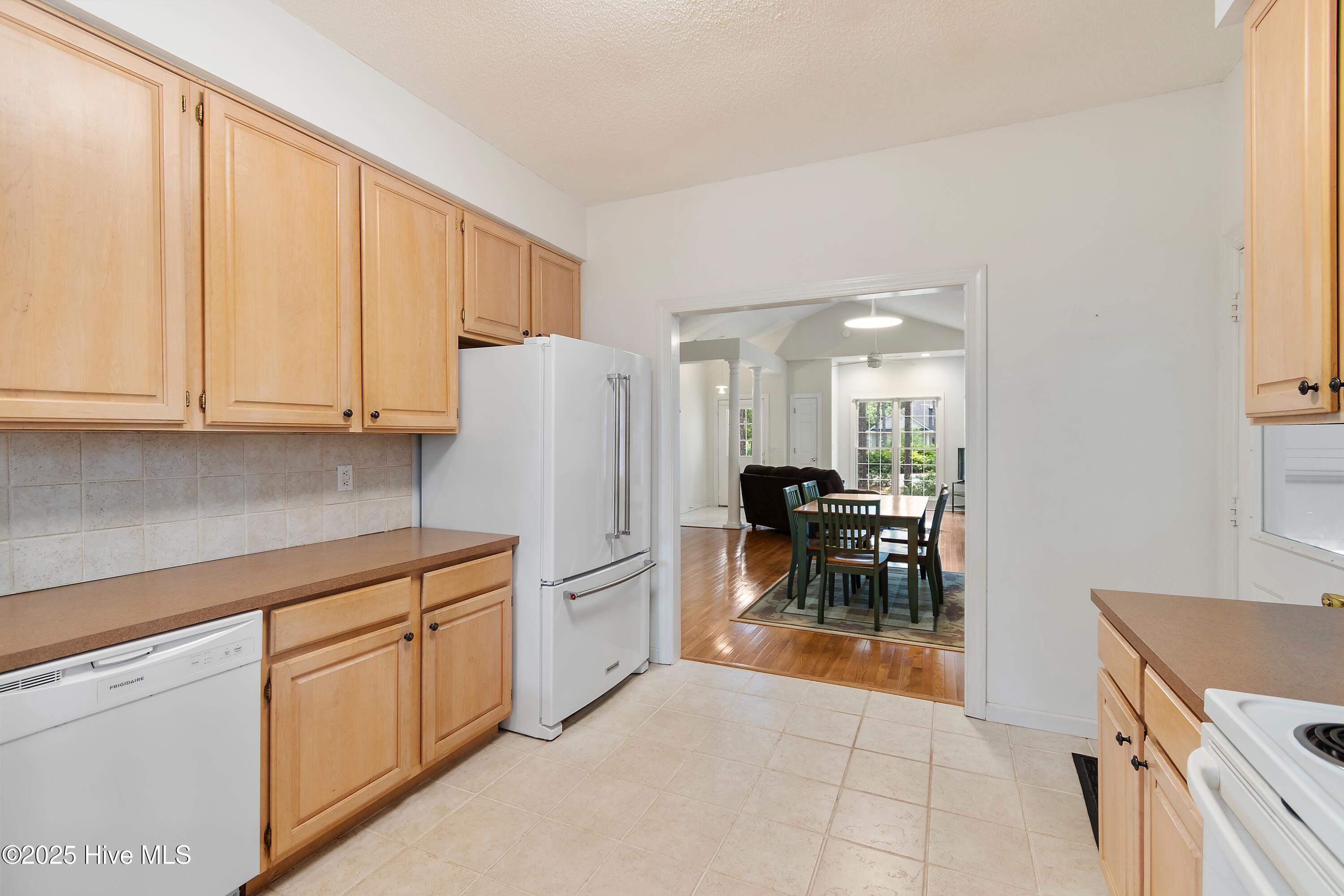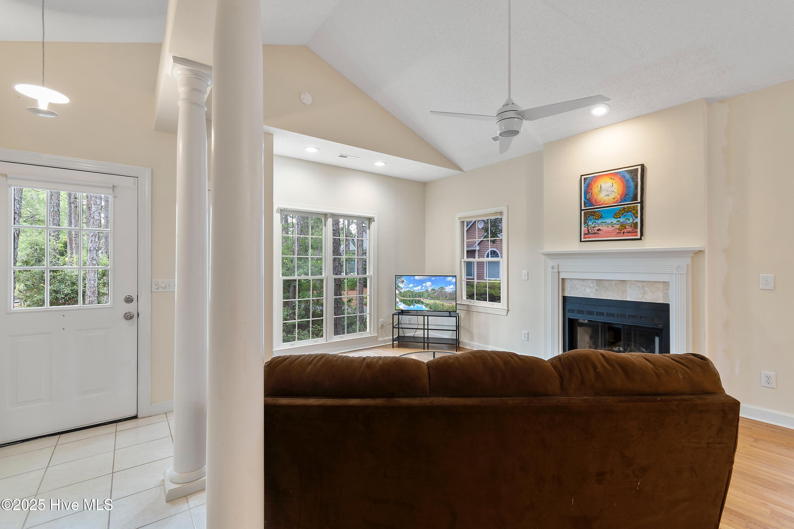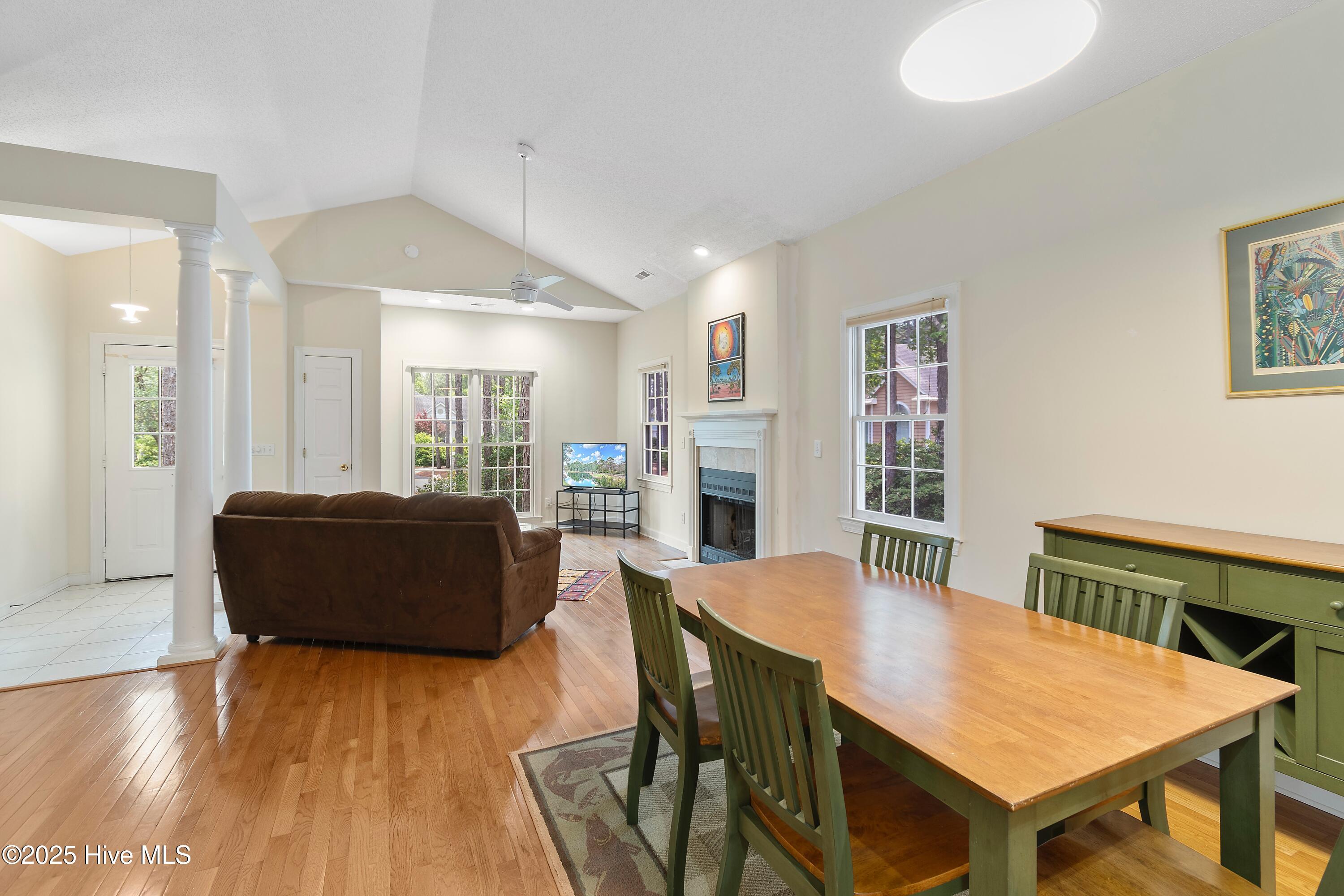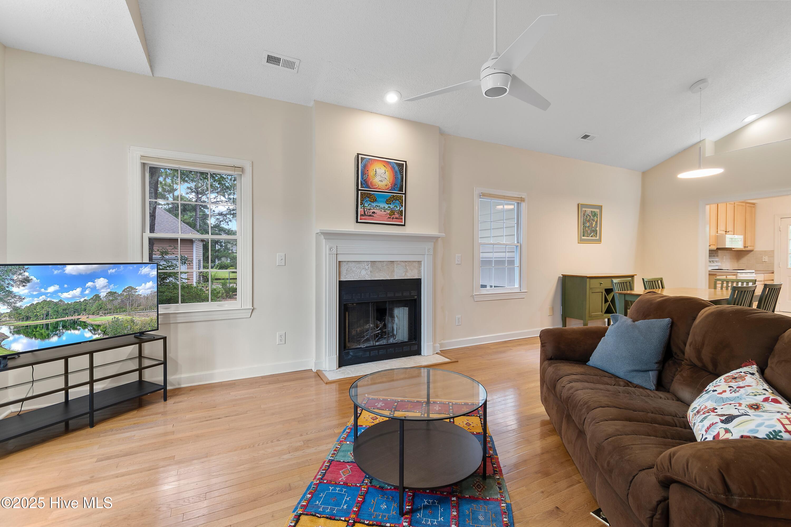 Featuring a tiled entry floor, 12-foot vaulted ceiling, and warm oak flooring throughout the main living area, you can enjoy cozy evenings by the wood-burning fireplace. Entertain guests in the airy dining area that extends to the tiled floor in the open kitchen, or, unwind in tne screened-in porch featuring an unobstructed view of the pond - the perfect spot to start your morning or relax at the end of the day.