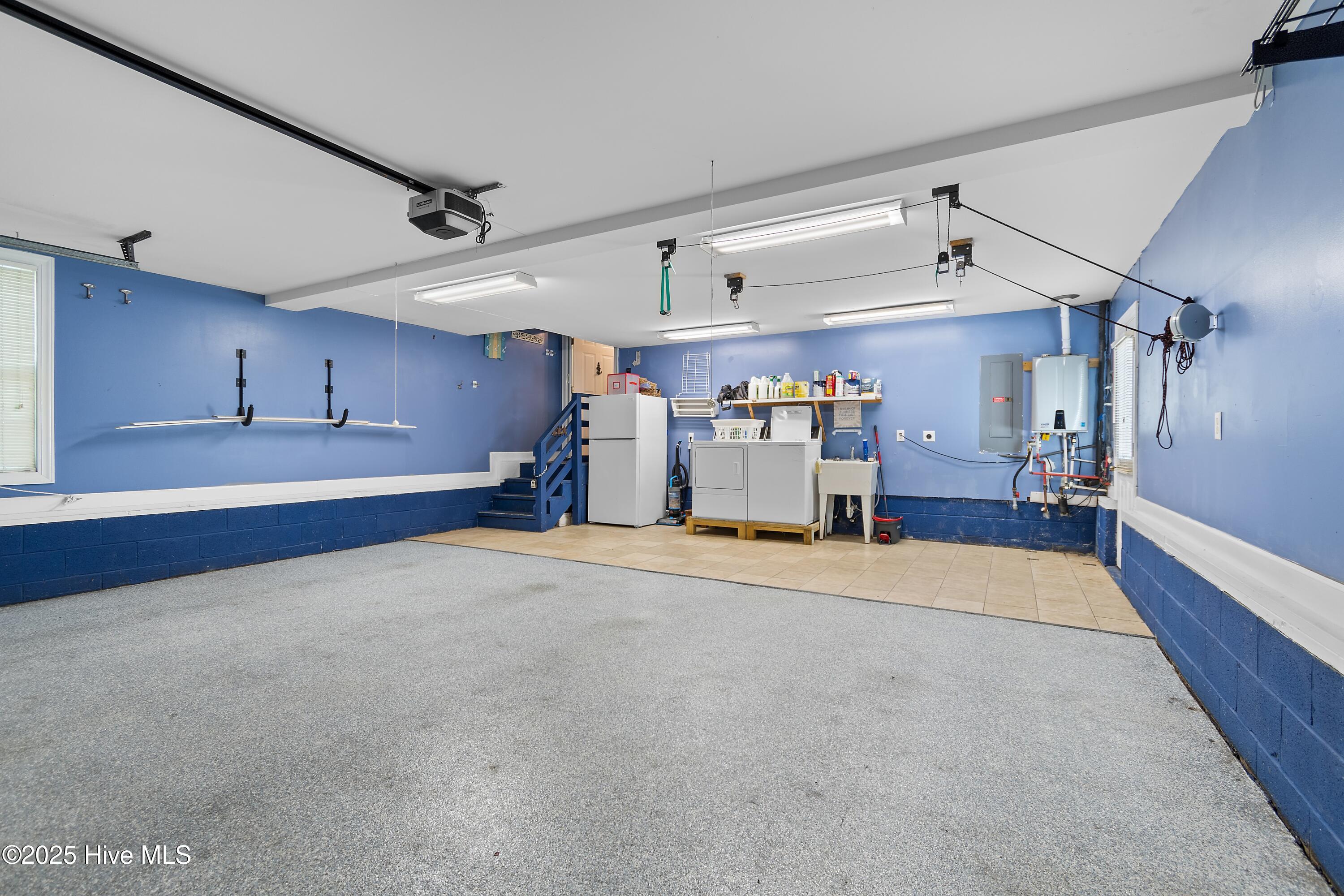 The two-car garage includes a tiled laundry area, ideal for sandy towels and beach gear. Upstairs features carpeted bedrooms and easy-care laminate flooring. The kitchen is well equipped with propane instant hot water, water filtration system, gas cooktop, and electric oven for easy cleaning.