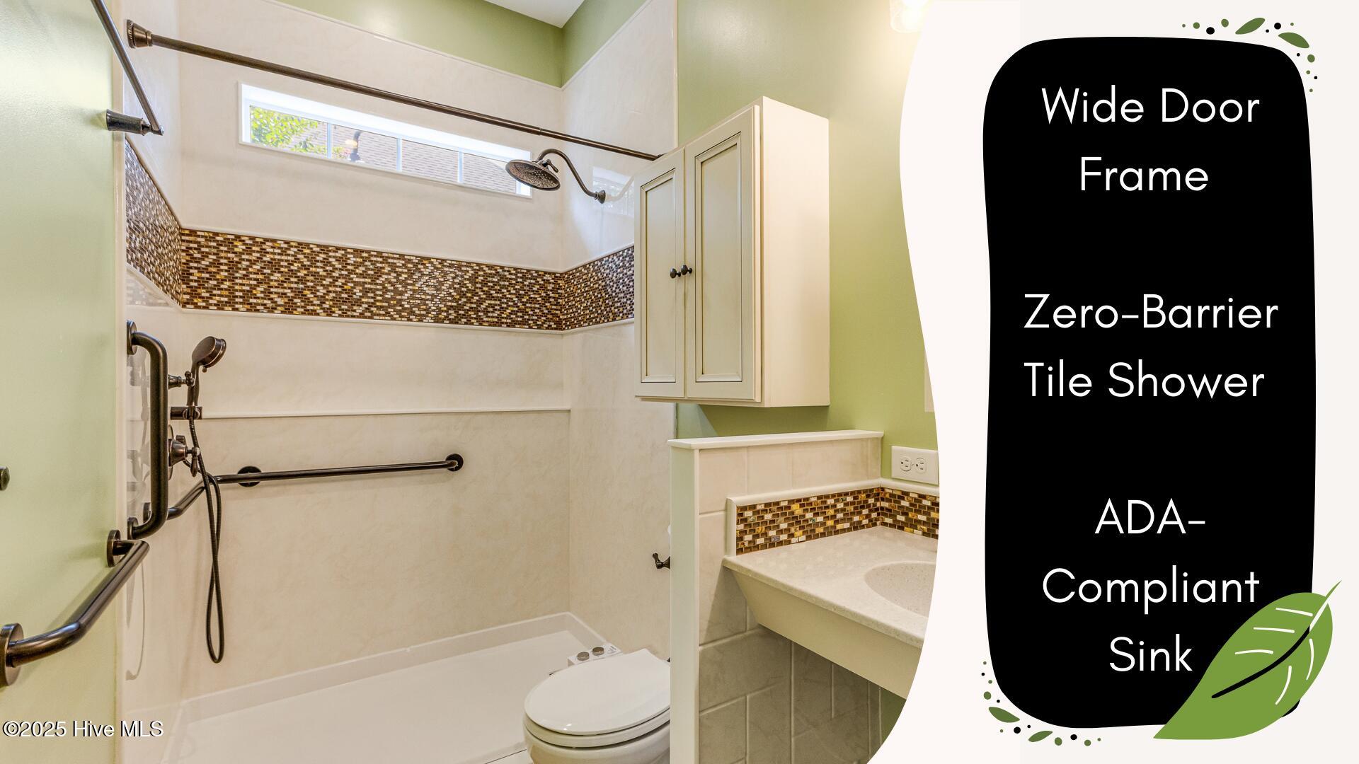 Thoughtful upgrades make this home accessible for all: the secondary bath features a wide door frame, zero-barrier tile shower, and ADA-compliant sink—perfect for guests or family members with mobility needs.