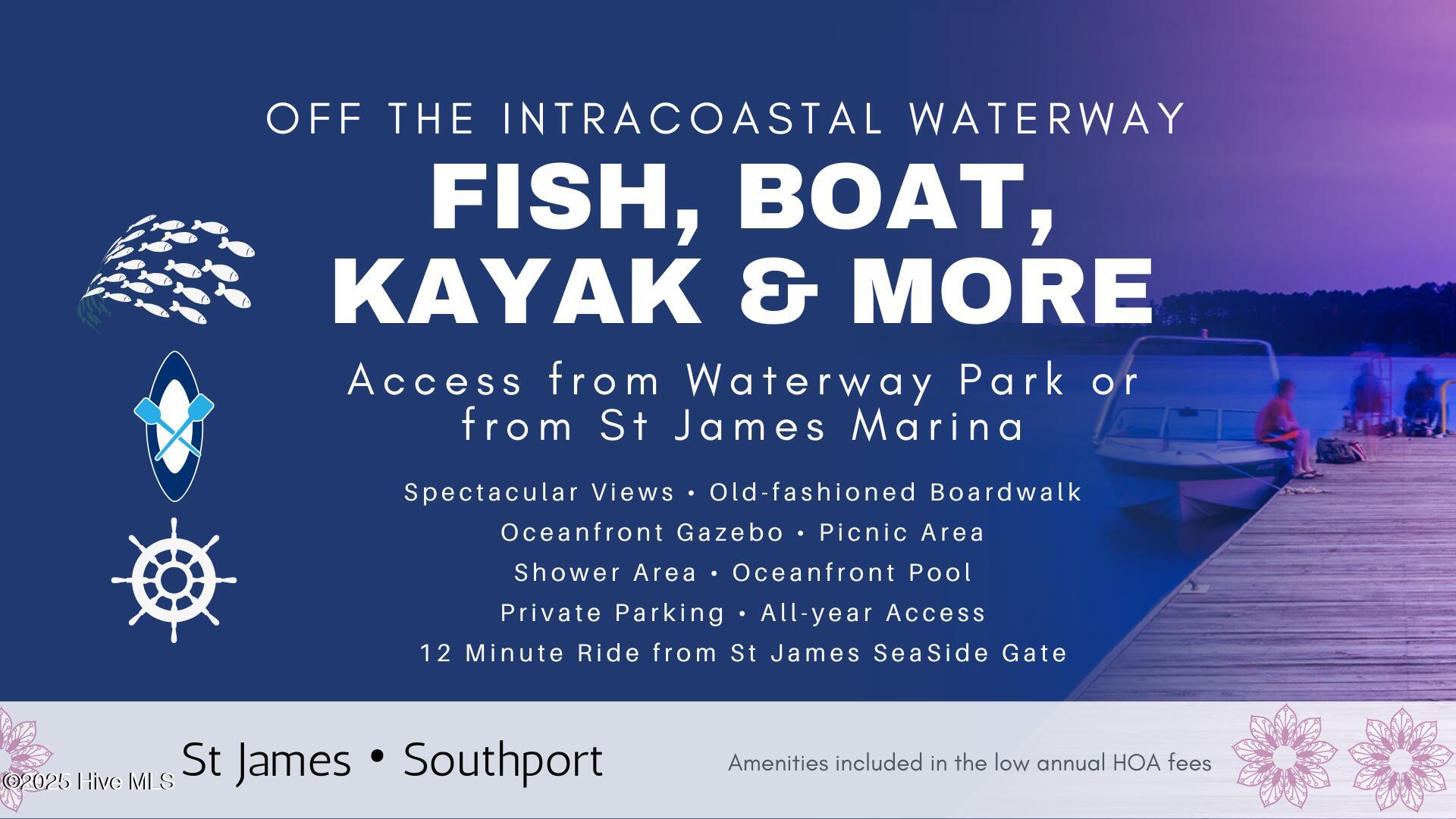 * Waterway Park Amenities: Fitness/walking trail, children's playground, picnic shelters, dog park, volleyball court, bocce ball, kayak launch, covered pier to the Intracoastal Waterway, covered pavilion with picnic tables, and a scenic plant trail