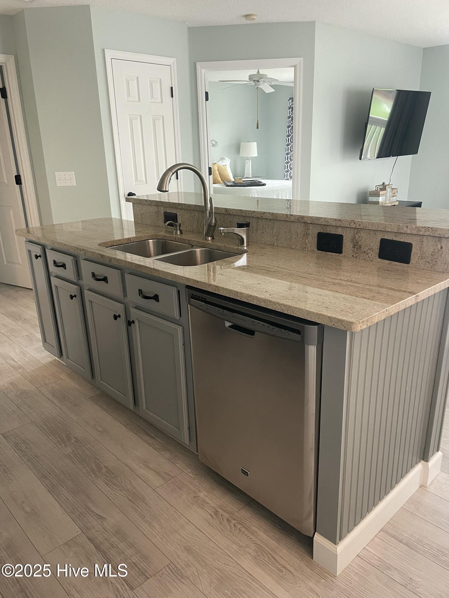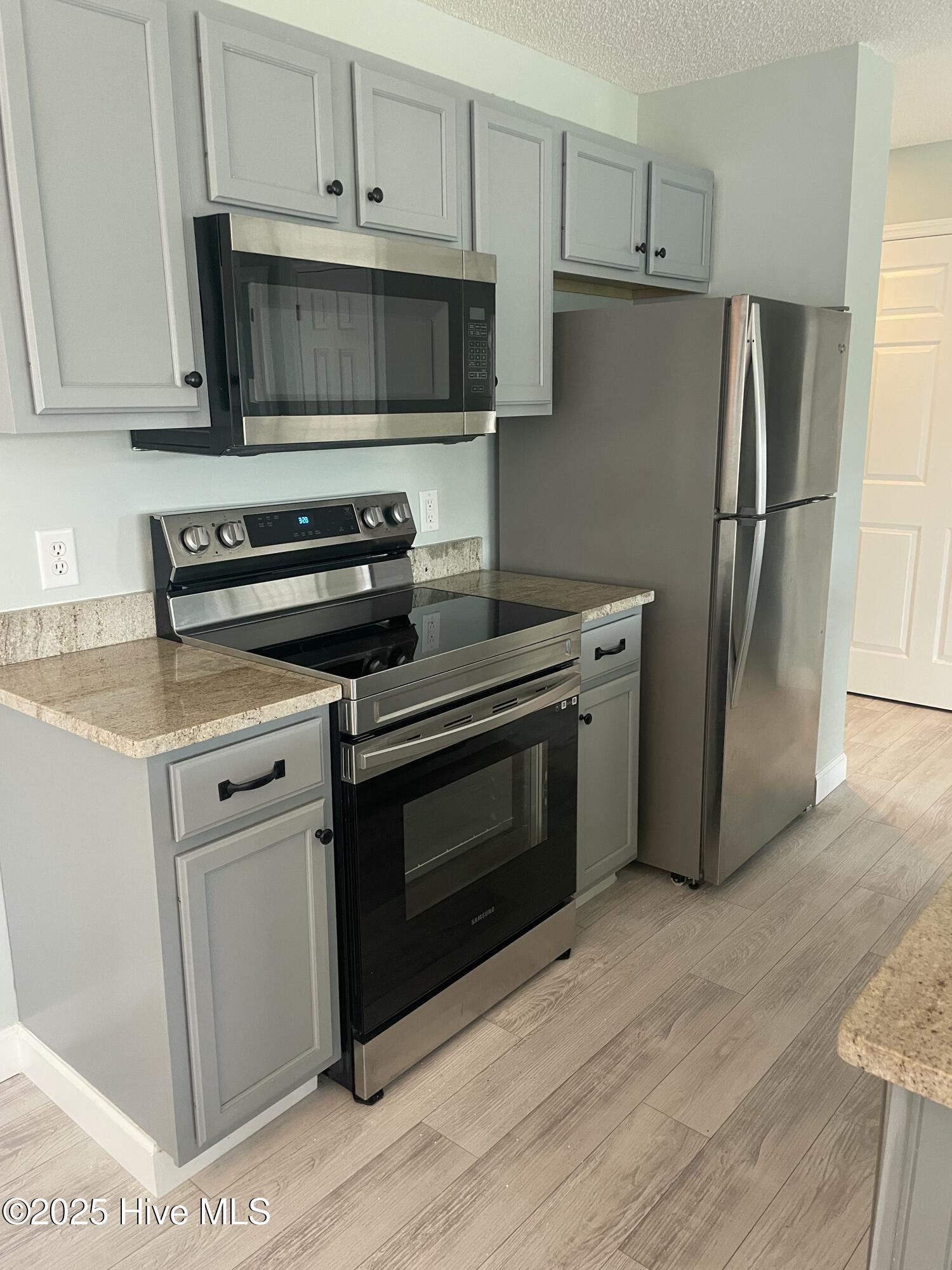 Modern kitchen with granite countertops, new built-in microwave and oven, dishwasher, refrigerator, disposal, and Insinkerator hot water dispenser.