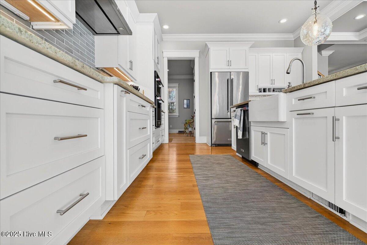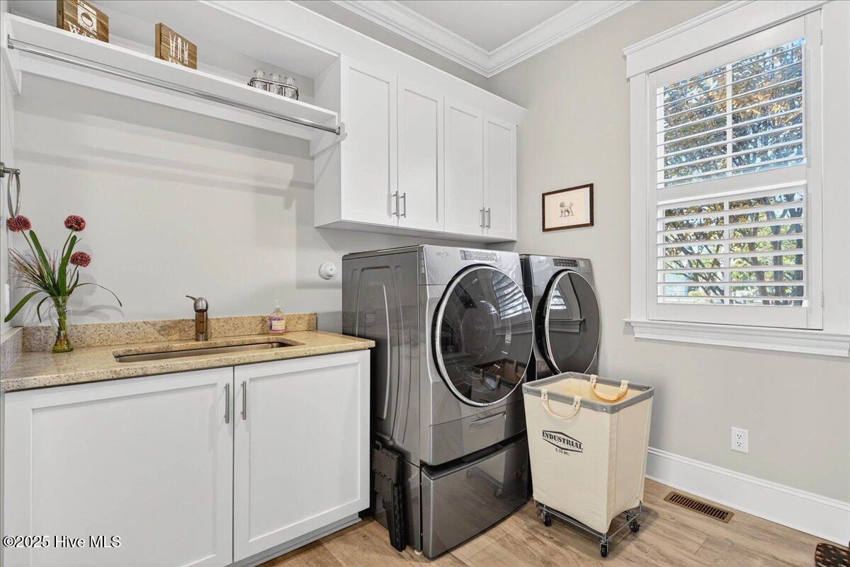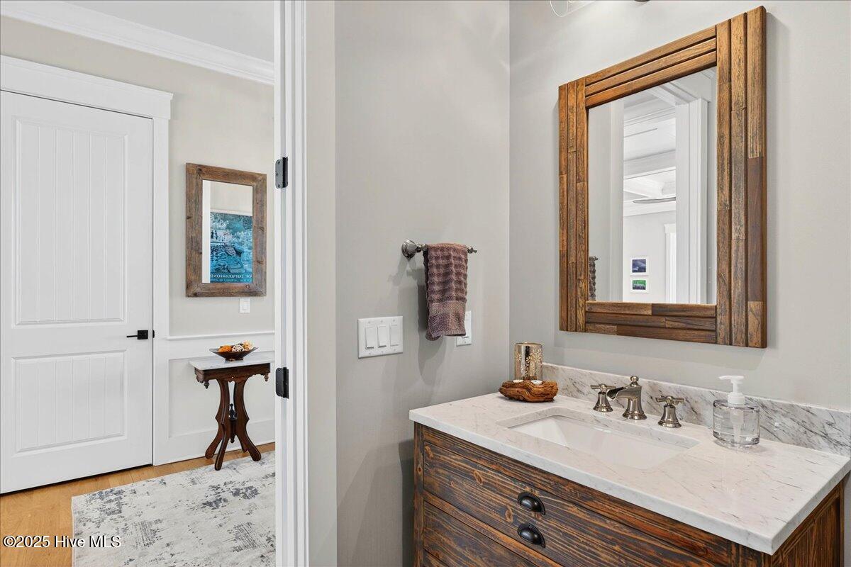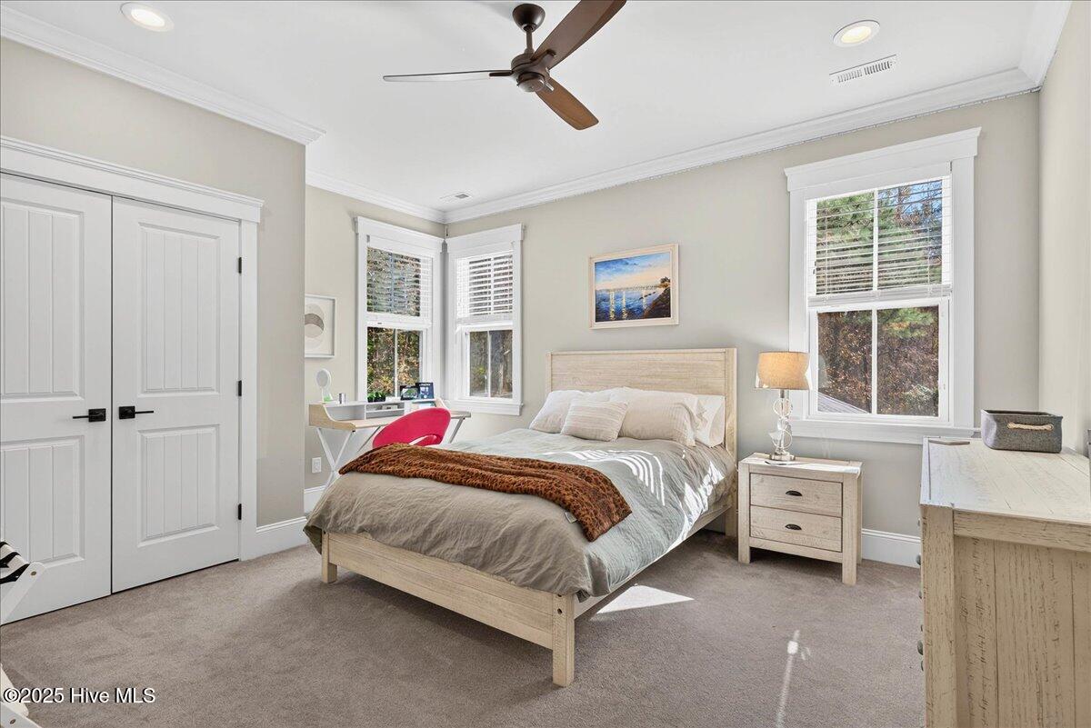 Situated within an exceptionally private cul-de-sac and embraced by views of protected woodland and a tranquil creek, this distinguished Low Country residence masterfully crafted by acclaimed luxury builder Will Thornton Custom Homes, presents a lifestyle defined by elegance, serenity, and effortless coastal sophistication. Here, refined living unfolds across four beautifully appointed bedrooms, three and a half impeccably finished baths, a dedicated office, and an expansive bonus room, each space curated with thoughtful intention and superior craftsmanship, including 8-foot solid doors, 5-inch white oak flooring, spray-foam insulation, and a central vacuum system. The gourmet kitchen acts as the home's culinary showpiece, where an impressive island, integrated lighting, and discreetly concealed outlets blend form and function with remarkable artistry. In the great room, a reclaimed Cape Fear River railroad tie, reimagined as a floating mantel and framed by shiplap, anchors the space with understated elegance. Designed for those who cherish both privacy and connection with nature, the home's expansive screened-in porch, gracious outdoor deck, and fire pit enclave create an atmosphere reminiscent of a luxury retreat where mornings begin with ocean breezes and evenings unfold under a canopy of stars. Additional indulgences include an oversized heated and cooled garage with epoxy flooring, Azek front-porch decking, an outdoor shower, spa-caliber tiled baths, a fenced-in yard, and refined exterior lighting that lends a soft architectural glow after dusk. Set within the prestigious gated community of St. James, residents enjoy an enviable lifestyle enriched by more than $100 million in world-class amenities including championship golf, a private marina, waterfront dining, multiple resort-style pools, tennis and pickleball courts, state-of-the-art fitness centers, parks, nature trails, and an exclusive oceanfront beach club. Just moments from the St. James Marina