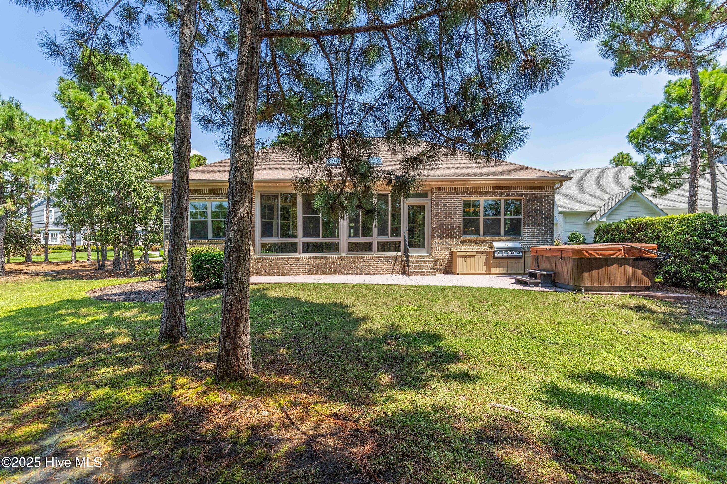Secondary bedrooms on the main level offer wonderful flexibility, including one currently outfitted with a Murphy bed system perfect for accommodating guests while maintaining office or hobby space when needed. Upstairs, a generous bonus suite with full bath and walk-in closet creates a private retreat ideal for extended visitor stays, a dedicated media room, or creative studio where possibilities are limitless. Step through French doors to your private outdoor sanctuary where thoughtful design transforms ordinary into extraordinary. A therapeutic spa hot tub beckons after golf rounds or beach days, while your custom outdoor kitchen rivals indoor culinary spaces with built-in gas grill, marine-grade cabinetry engineered to withstand coastal conditions, and gleaming granite counters. The oversized patio, embraced by mature wooded privacy, becomes your favorite room during golden-hour cocktails, weekend brunches, or starlit evenings.