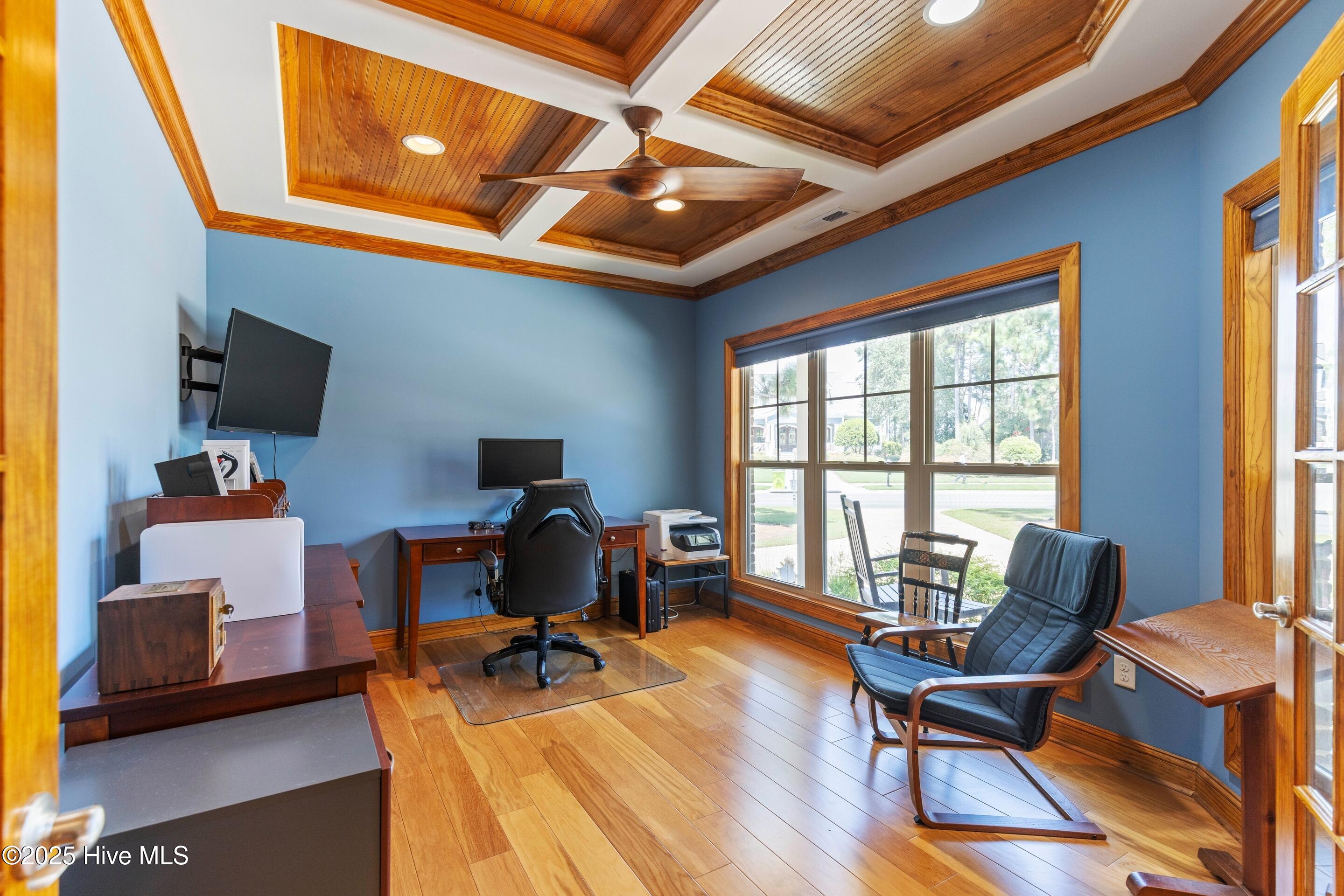 Timeless Elegance Meets Championship Living - Impeccably Refreshed Trusst Builders Masterpiece. Discover the pinnacle of coastal Carolina living at 3220 Moss Hammock Wynd which is ready to welcome you to move-in perfection within the coveted Reserve of St. James Plantation. This meticulously maintained Trusst Builders modified Grace II model showcases the finest in custom craftsmanship, elevated amenities, and access to an exceptional lifestyle. From your arrival, the all-brick facade, dramatic rooflines, and columned front porch telegraph enduring quality and refined taste. Step inside to discover soaring coffered and tray ceilings that draw the eye upward, while custom millwork and sun-drenched windows flood every room with warmth and sophistication. The heart of the home features an expansive open-concept living area centered around a gas fireplace with near-by built-in cabinetry, creating the perfect balance of grandeur and approachability.