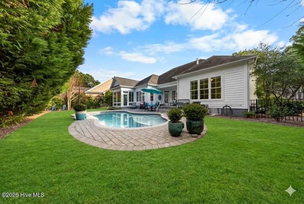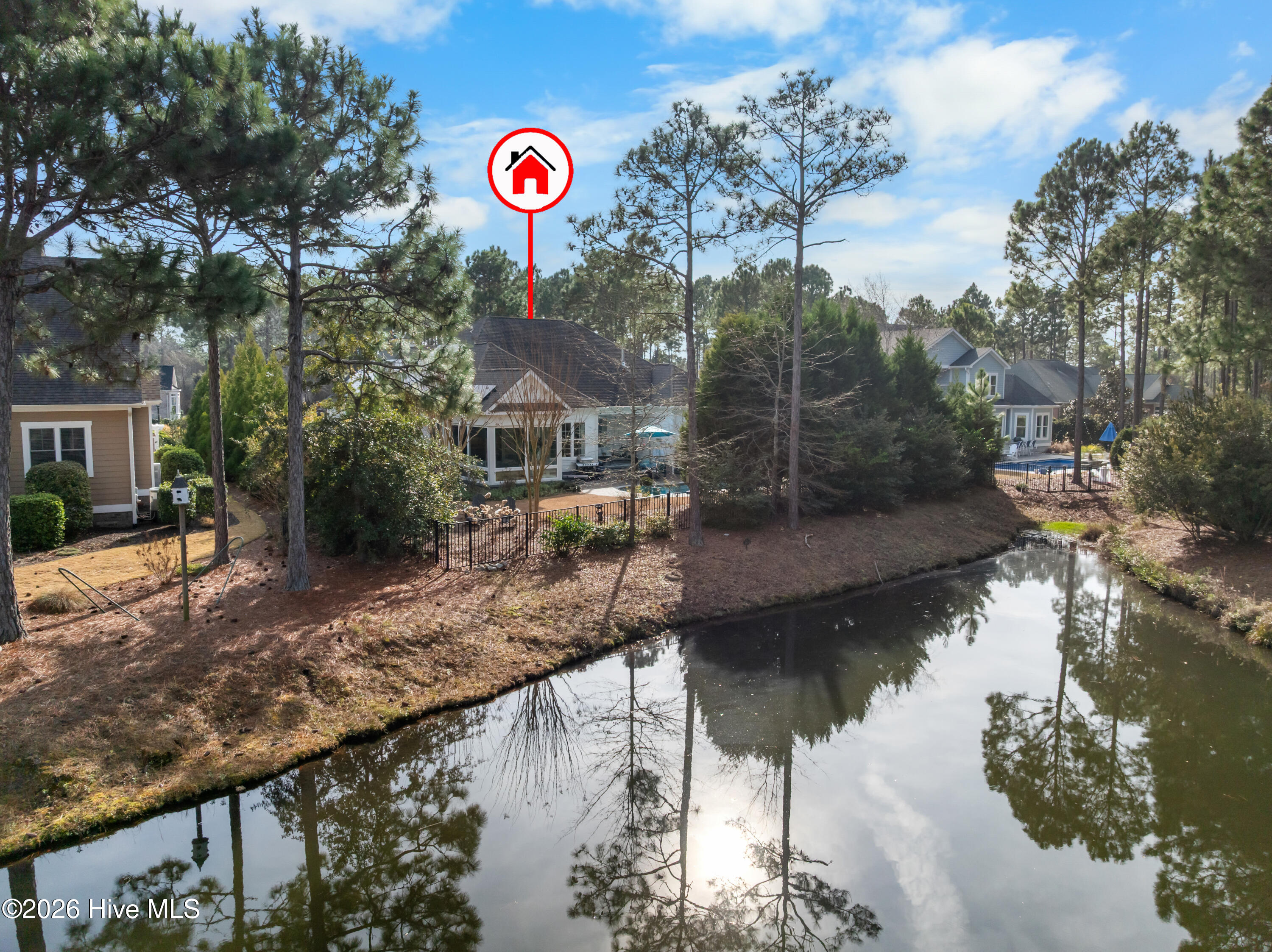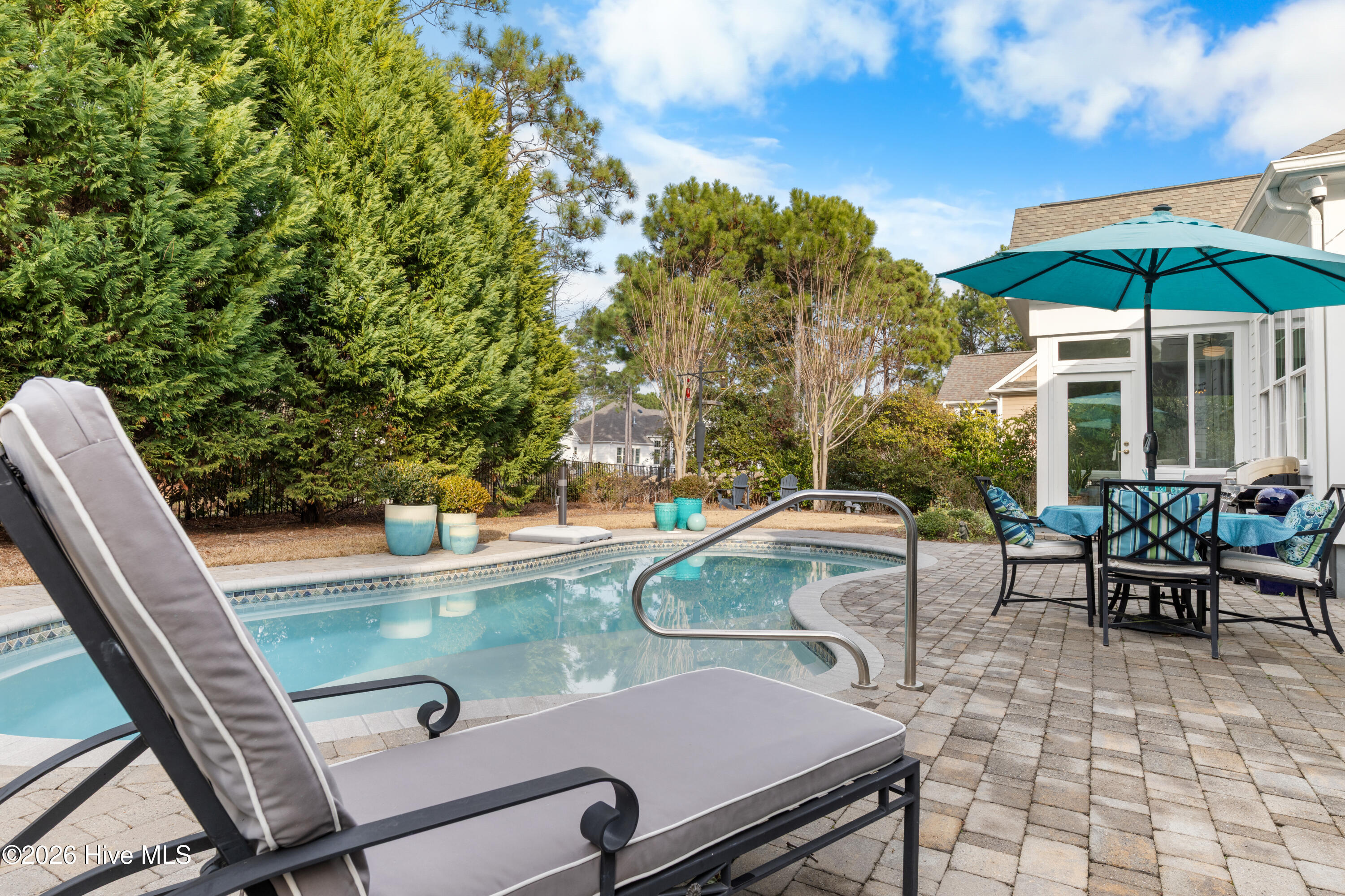 Outdoor living is a defining feature of this property. The private saltwater pool is surrounded by seating areas overlooking the pond, creating an inviting setting for relaxation or entertaining. The pond is stocked with largemouth bass, adding a unique lifestyle element and reinforcing the home's connection to nature. Mature landscaping enhances privacy while maintaining open sightlines and a peaceful backdrop. A glass-enclosed porch and expansive patio further extend the living space outdoors, creating a true retreat-like atmosphere.