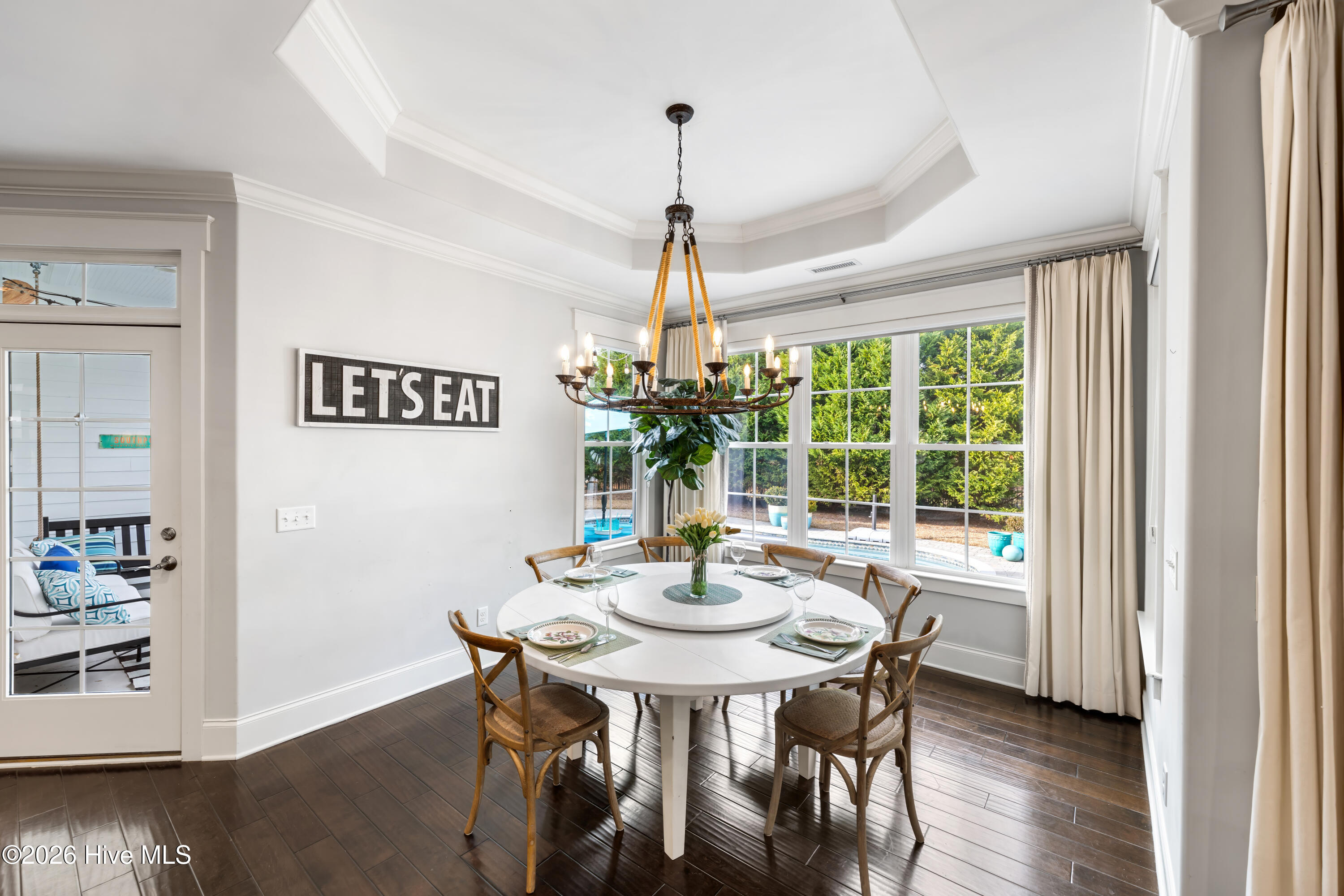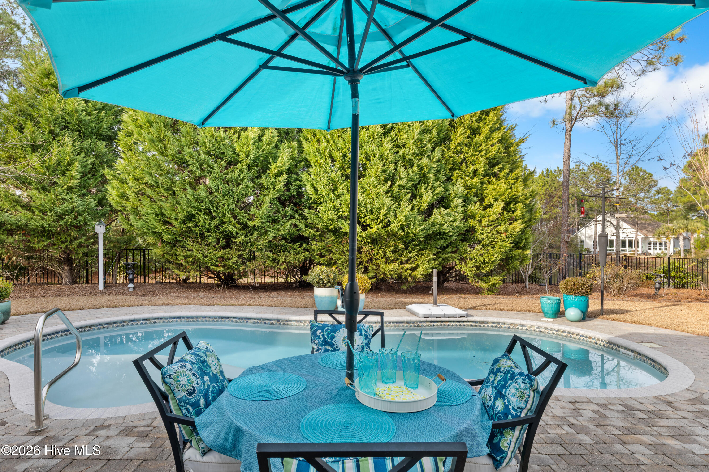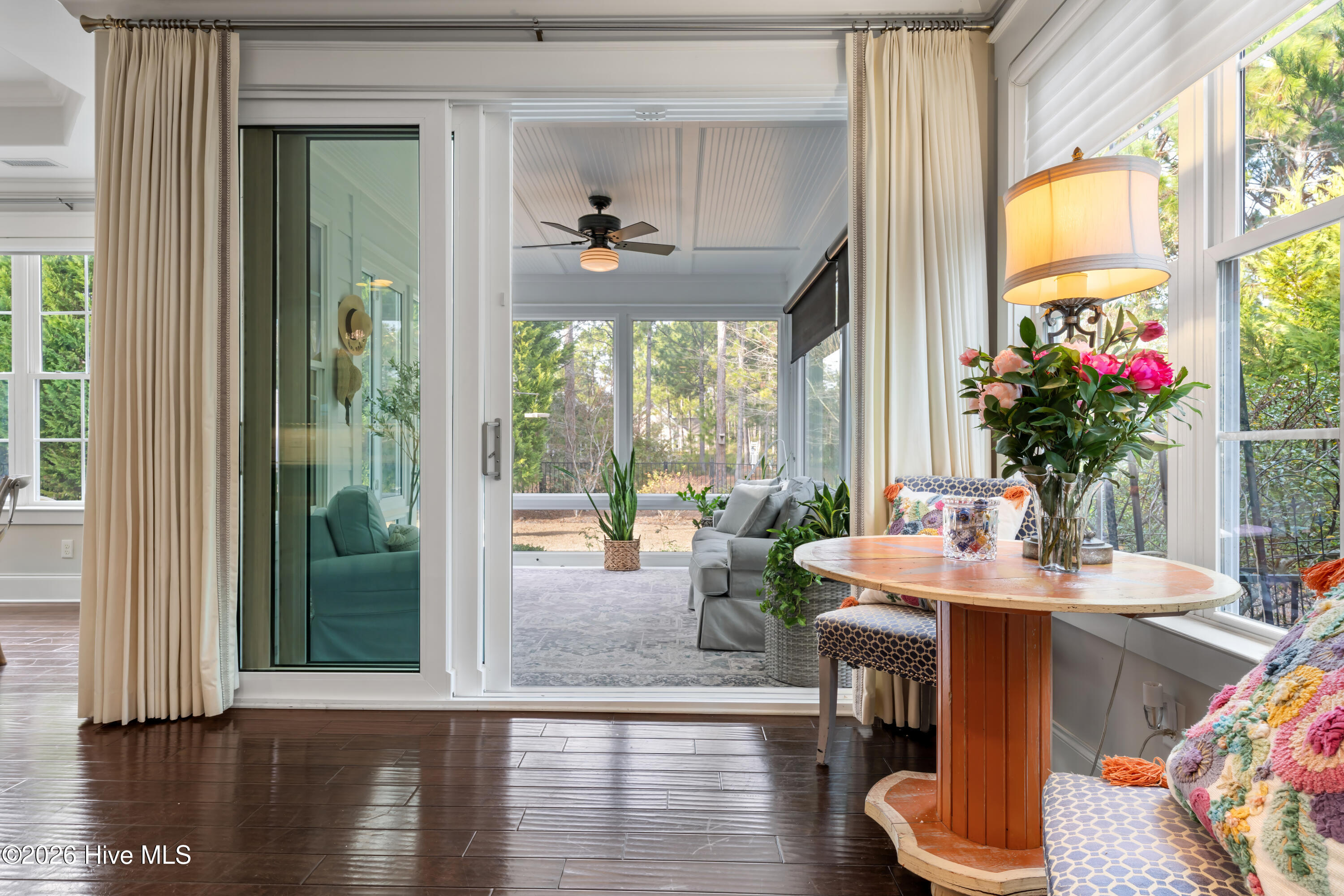 Outdoor living is a defining feature of this property. The private saltwater pool is surrounded by seating areas overlooking the pond, creating an inviting setting for relaxation or entertaining. The pond is stocked with largemouth bass, adding a unique lifestyle element and reinforcing the home's connection to nature. Mature landscaping enhances privacy while maintaining open sightlines and a peaceful backdrop. A glass-enclosed porch and expansive patio further extend the living space outdoors, creating a true retreat-like atmosphere.