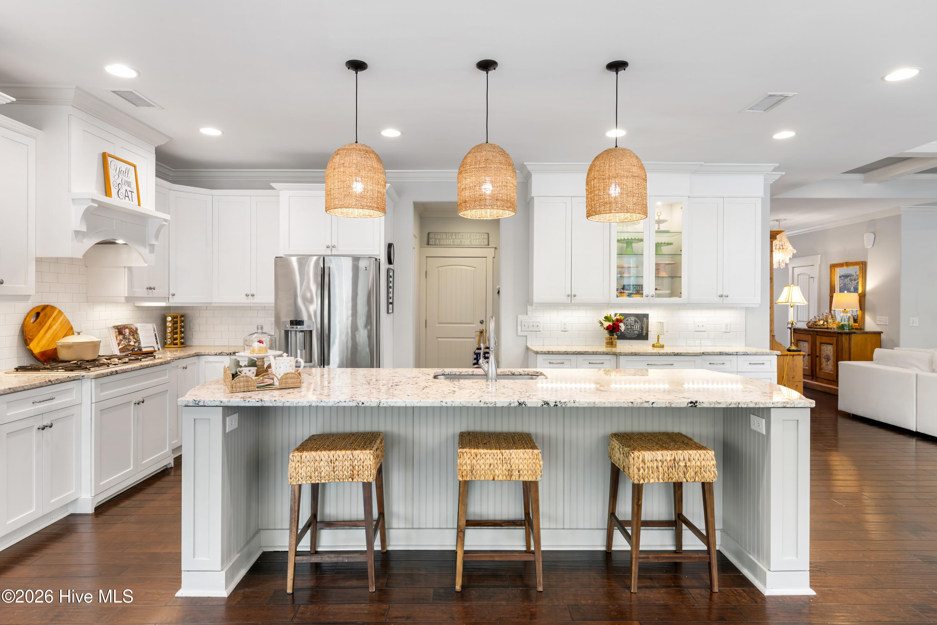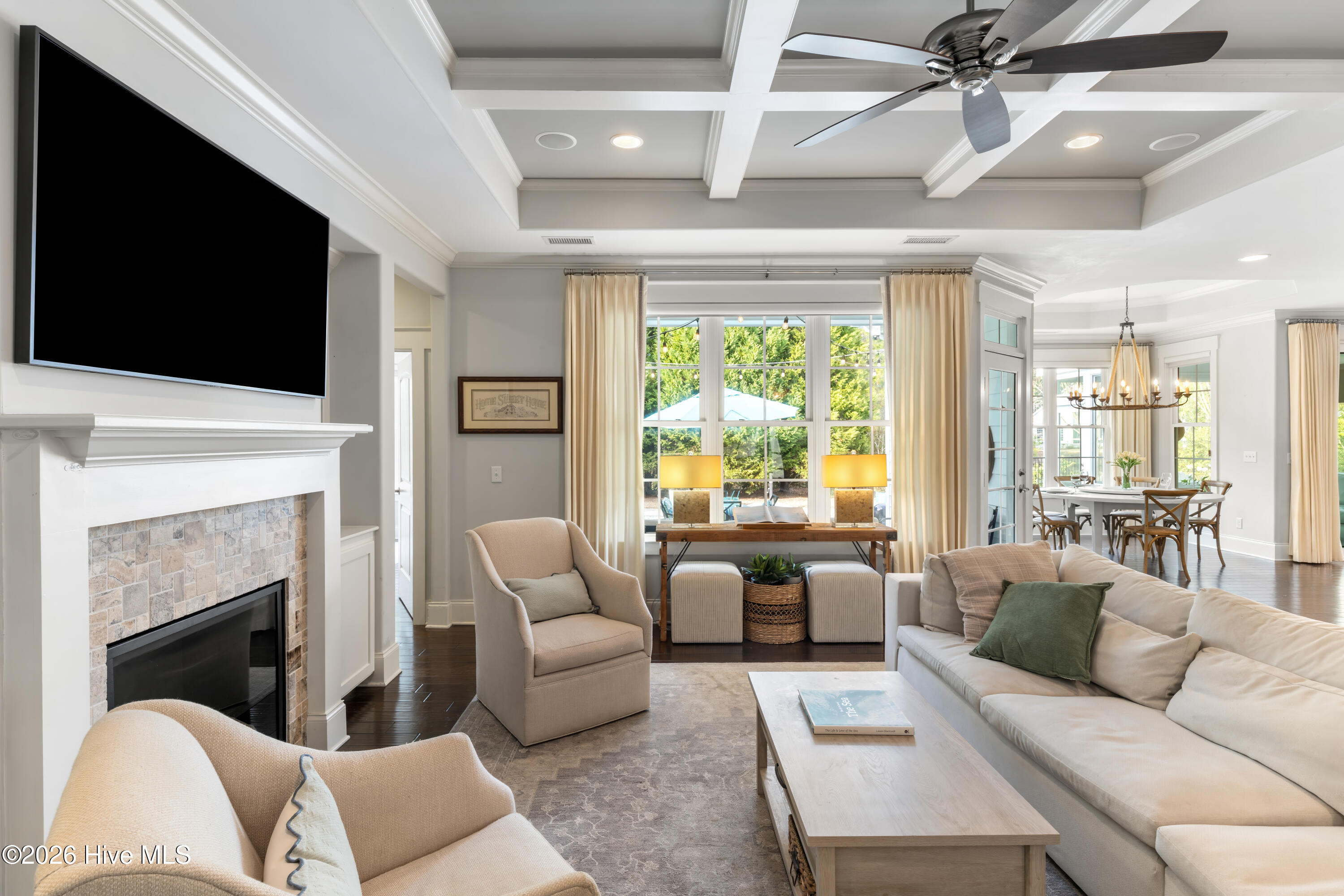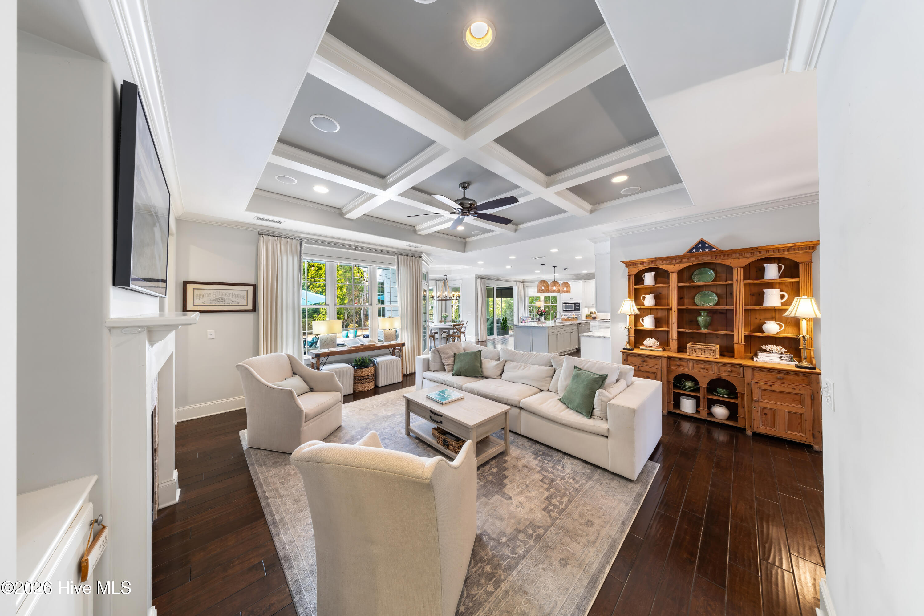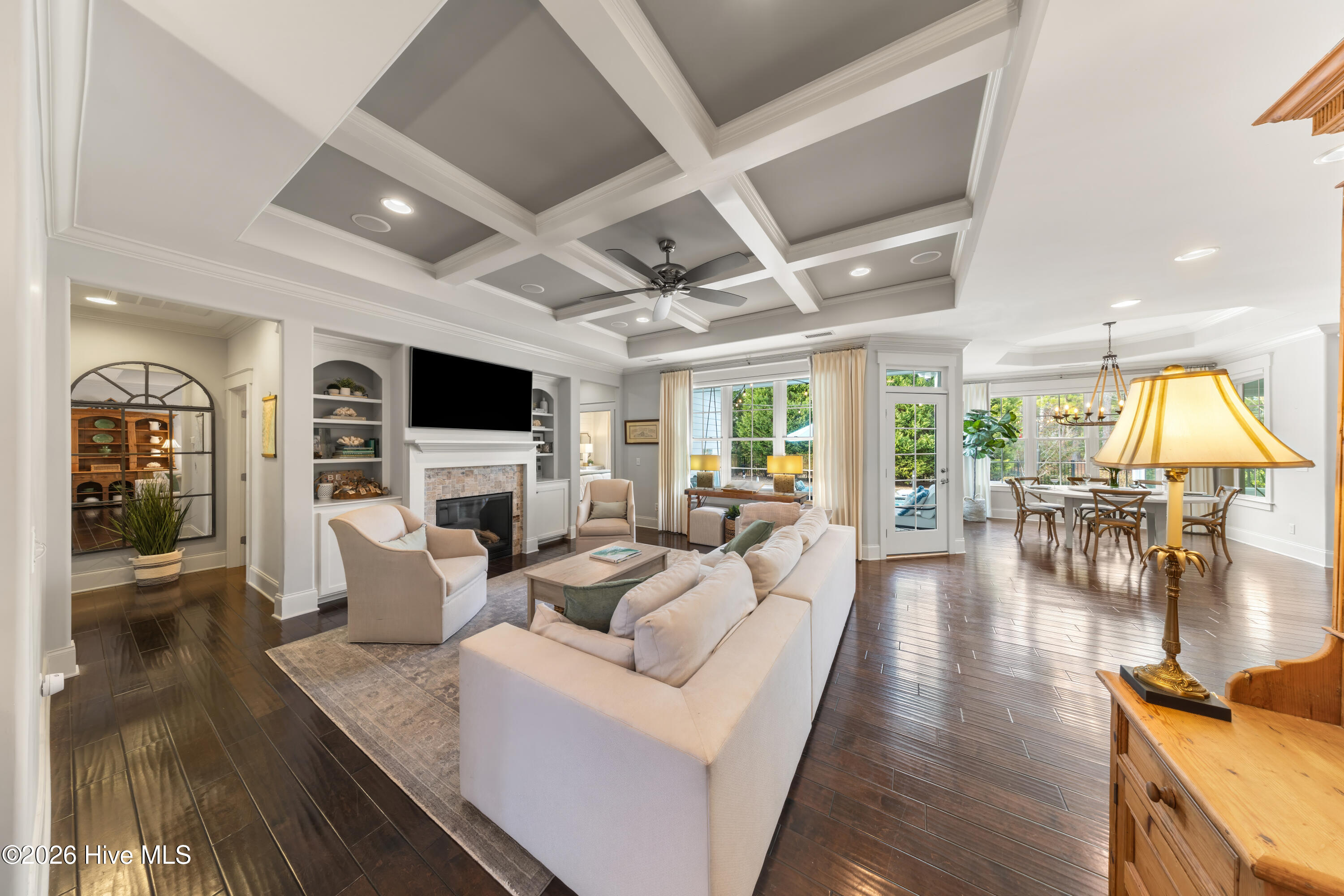 Inside, refined elegance meets functional design. Rich hardwood floors, detailed millwork, quality craftsmanship, and an abundance of natural light define the interior. The expansive open-concept layout allows for seamless flow between the main living areas and outdoor spaces, enhancing both everyday living and entertaining. The impressive kitchen is both beautiful and practical, showcasing custom cabinetry, granite countertops, gas cooking, premium stainless-steel appliances, and a substantial island that anchors the sun-filled dining and living areas, all centered around a striking fireplace. The well-proportioned floor plan offers generous living spaces and exceptional flexibility. The first floor includes a private mother-in-law suite, ideal for guests or multigenerational living. The primary suite is a true retreat, featuring tray ceilings, abundant natural light, and a spa-inspired bath with dual vanities and an oversized walk-in shower. Additional guest rooms and flexible spaces provide comfort and privacy throughout the home. An expansive upstairs bonus room offers exceptional separation with its own door, full bath, and separate HVAC zone.