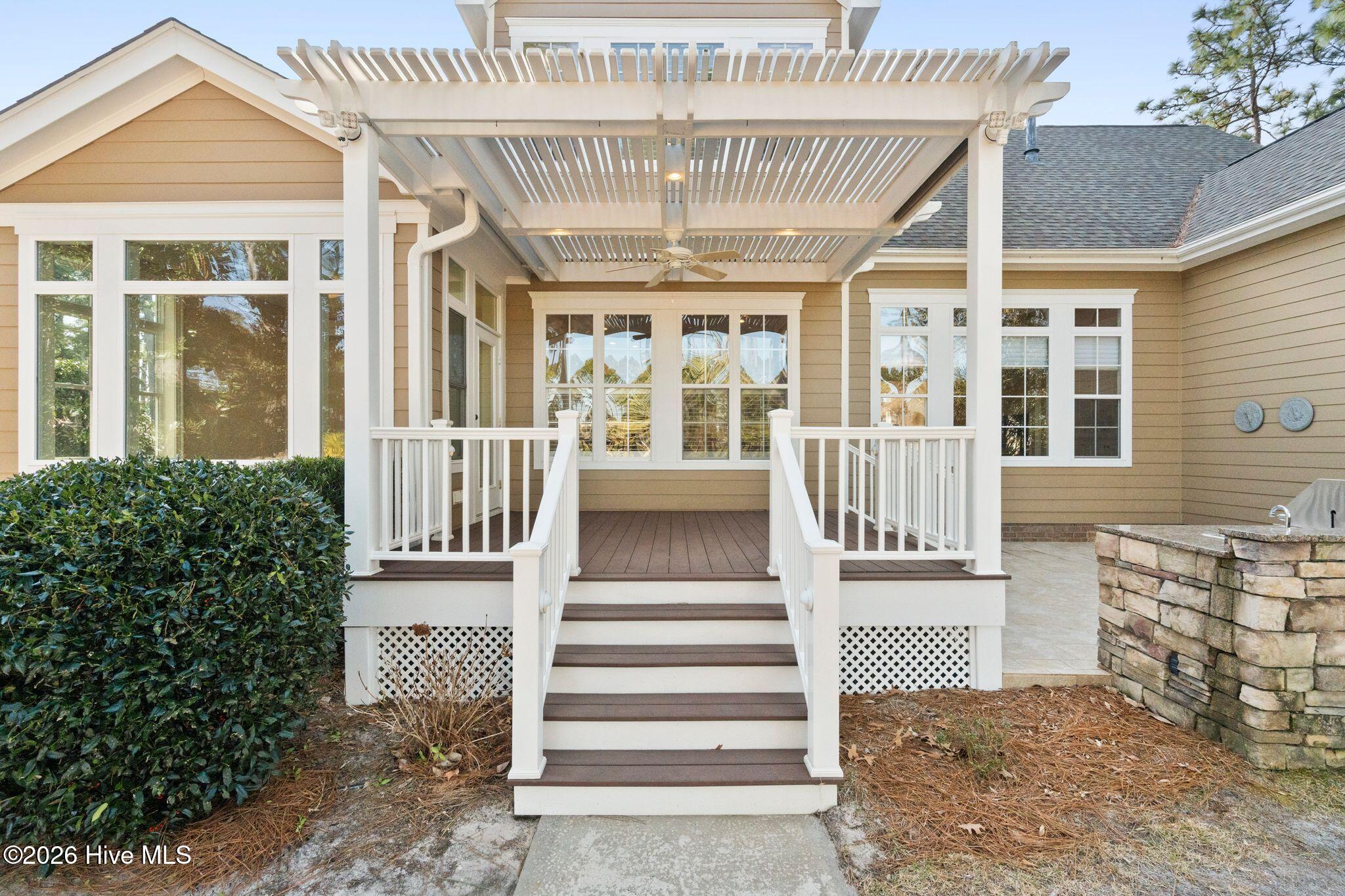 The chef's kitchen opens seamlessly to the main living area, creating an entertainer-forward layout. Outdoors, the rear patio is a true differentiator—complete with a custom built-in grill and bar—perfect for hosting while enjoying tranquil, panoramic golf course views. From morning coffee on the front porch to evening gatherings out back, the outdoor living experience stands apart.