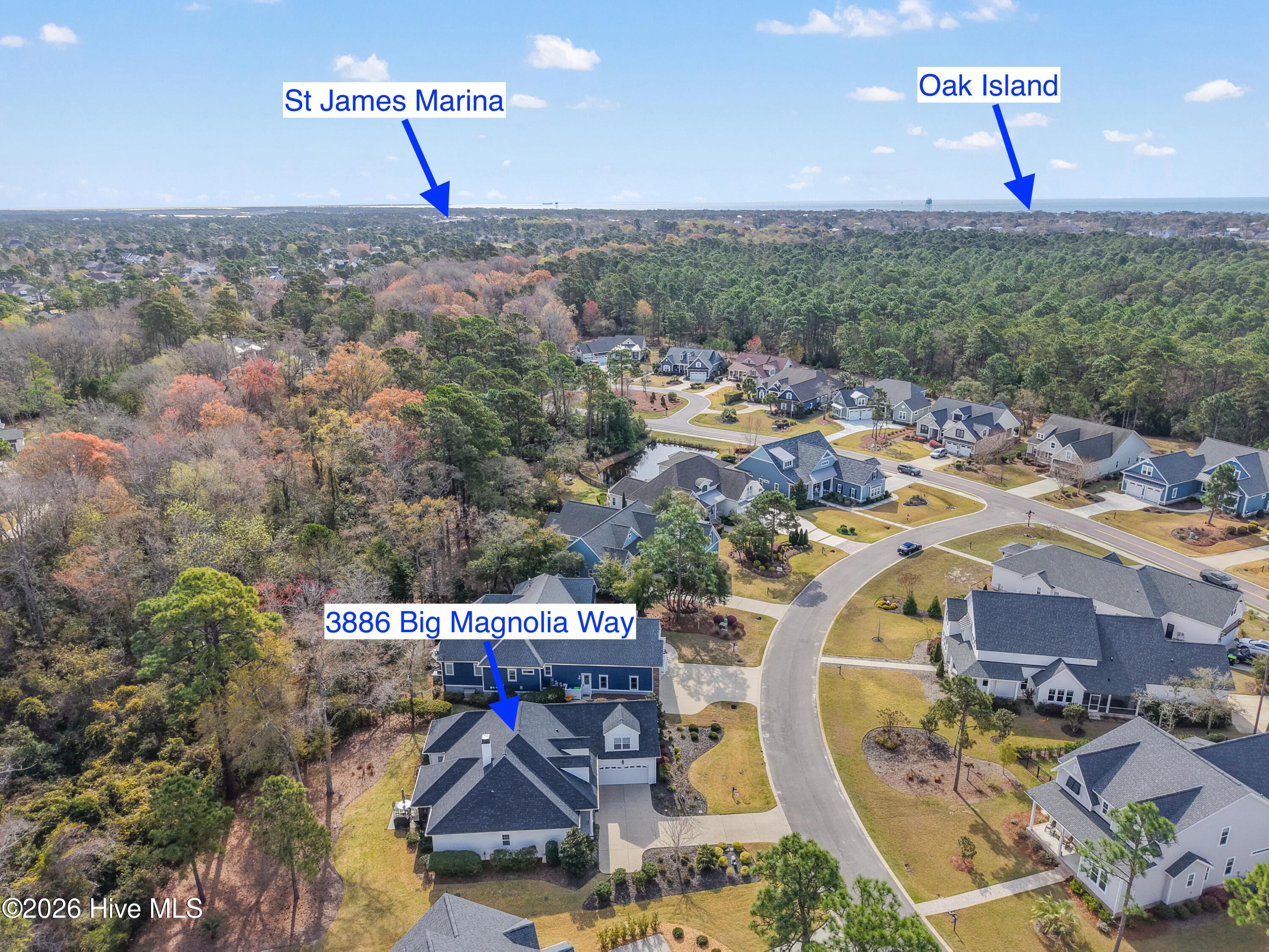 A rare blend of coastal charm and refined luxury, this home is tucked within an exclusive bird sanctuary community, offering a serene private setting where nature becomes part of your everyday backdrop. Imagine family and friends gathering after a sun soaked day on the beach, an afternoon cruising the water, or hours unwinding by the pool. The home becomes the heart of every moment--open, inviting, and designed for effortless coastal living. Soft breezes drift through spacious living areas, while natural light pours in, highlighting elegant finishes and thoughtful craftsmanship. Outdoors, the tranquil surroundings create a sense of retreat, where the calls of coastal birds and the rustle of nature set the tone for peaceful evenings. This is more than a home; it's a sanctuary where luxury meets nature and every day feels like a getaway. Whether you're looking for a second home or making it your forever slice of paradise you will feel right at home at 3886 Big Magnolia Way. As a St. James resident, you'll enjoy access to four gated entrances, a private beach club with showers, gated parking and pool, a full-service marina featuring Beacon 315 Restaurant and Tiki Bar, The Apothecary boutique pharmacy, parks, trails, kayak launch, dog parks and an Amphitheatre. Optional club membership offers 81 holes of championship golf, five restaurants, indoor and outdoor pools, tennis, pickle ball, croquet, and three state-of-the-art fitness centers. St. James offers the best of both worlds: the ease of a lock and leave lifestyle and the fulfillment of true coastal living.